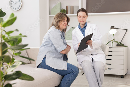 Weight loss. Nutritionist consulting overweight woman in clinic