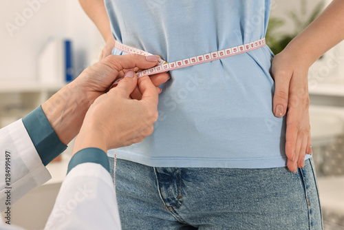Weight loss. Nutritionist measuring patient's waist with tape in clinic, closeup