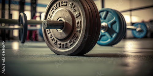 Weights in gym room close up horizontal photo - Generative AI