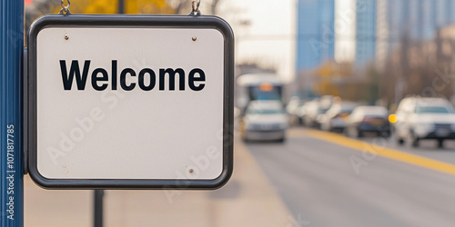 Welcome sign in urban setting, inviting visitors to area