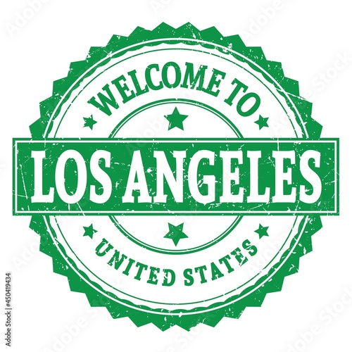 WELCOME TO LOS ANGELES - UNITED STATES, words written on green stamp