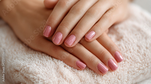 Well-manicured hands resting on a soft towel, with elegant pink nail polish shining under natural light, creating a serene and calming atmosphere in a cozy setting.