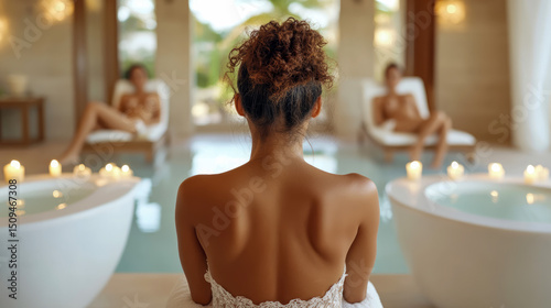 Wellness concept: a woman in a spa setting, viewed from the back with bathtubs and relaxing individuals in the distance