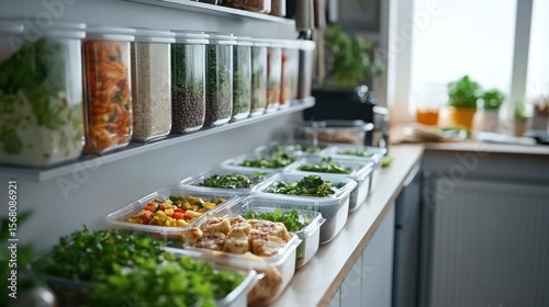 Well-stocked kitchen featuring organized food in clear containers and meal prep containers