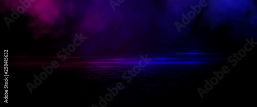 Wet asphalt, reflection of neon lights, a searchlight, smoke. Smoke, smog. Dark background scene of empty street, night view, night city. Neon red and blue light.