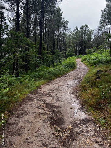 wet rainy day path trough the woods with eucalyptus trees on the pilgrimage along the road to Santiago in Portugal