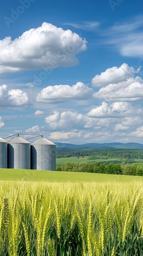 Wheat Fields Under a Bright Blue Sky With Silos in Background