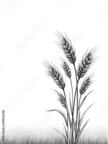 Wheat Stalks Drawing - Detailed pencil sketch of wheat stalks against a white background, set in a field of grass