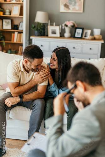 While at their counseling session, the mid adult female smiles and laughs while her husband tells a funny story about how they met.