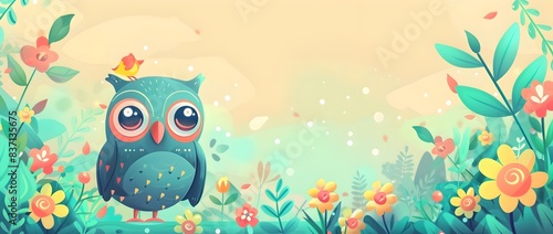 Whimsical Cartoon Owl Bird in Lush Garden with Playful Floral Border Frame and Blank Space for Mockup