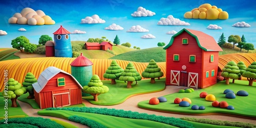 Whimsical clay countryside farm with colorful barns and rolling hills, whimsical, clay, countryside, farm, colorful