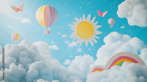 Whimsical dreamscape with hot air balloons sun and rainbows paper cut image