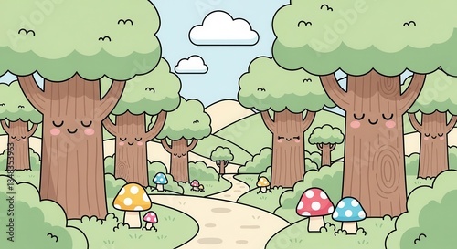 Whimsical forest scene featuring anthropomorphic trees and colorful toadstools along a winding path