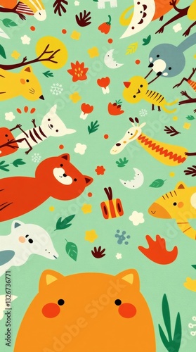 whimsical illustration of various animals in a joyful composition. the colorful design includes various animals such as giraffe, bear and others