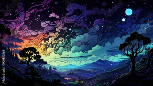 Whimsical Night Sky with Swirling Clouds and Silhouetted Trees
