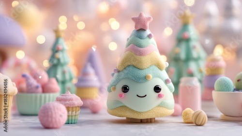 Whimsical pastel decorative Christmas tree with cute face surrounded by festive treats and ornaments in a soft-focus background