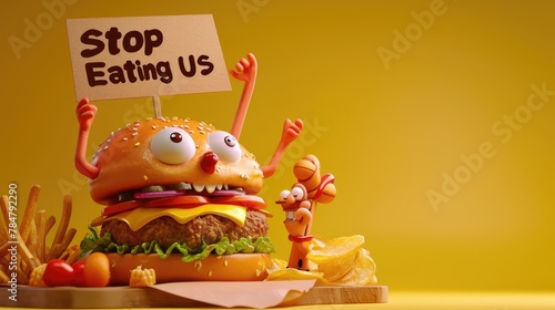 Whimsical plea: cartoon characters, fast food holding a sign 'Stop Eating Us.' A playful take on the concept of proper nutrition and the pursuit of a healthier lifestyle.