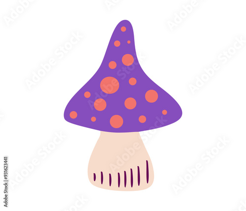 Whimsical purple mushroom with orange spots, poisonous mushroom for witch spells. Vector illustration, isolated on white background.