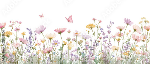 Whimsical watercolor floral meadow with delicate butterflies against an isolated transparent