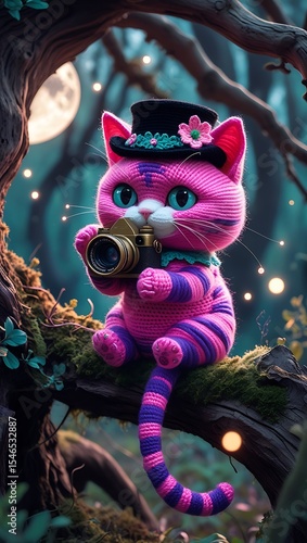 Whimsical Yarn Cat Photographer in Magical Moonlit Forest Fantasy Digital Art