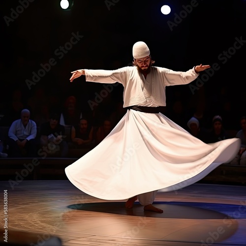 Whirling dervishes from Turkey, dancing on stage. Ai Generative.