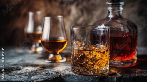 Whiskey is poured into a glass with ice cubes. There are additional glasses and a bottle on a dark stone surface. A warm light highlights the scene.