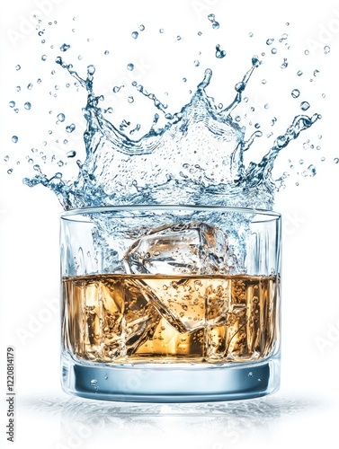 Whiskey splash, ice cubes, rocks glass, drink, white background, advertising