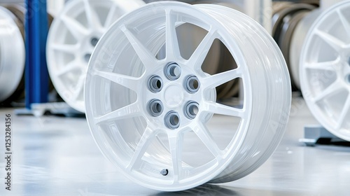 White alloy wheels in factory, production line
