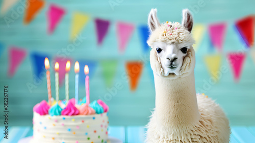 White Alpaca at Birthday Party with Cake, Balloons, Garland, Candles, and Fun Decorations. Lama with Colorful Birthday Theme.