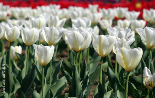 White and red tulips in the garden