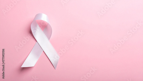 White awareness ribbon on light pink background, support for lung cancer awareness. Minimalist