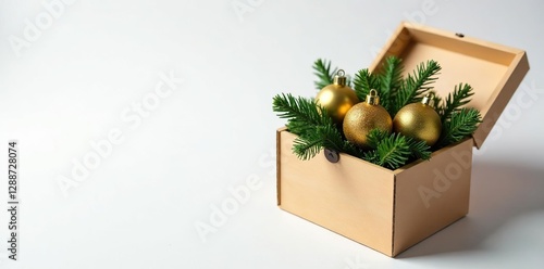 White background with an open wooden Christmas gift box containing greenery and golden ornaments, gift, box