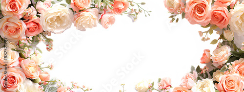 white background with peach and pink roses hanging from the top, creating an elegant floral arch for wedding or valentine's day decoration. backdrop is perfect for photography of flowers in full bloom