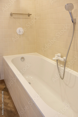 White bathtub and shower in the bathroom