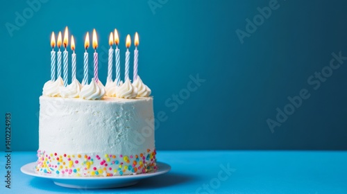 White birthday cake with lit candles on blue background featuring frosted icing and colorful flame decorations, ideal for celebration themes, party invitations, and festive greeting designs with copy