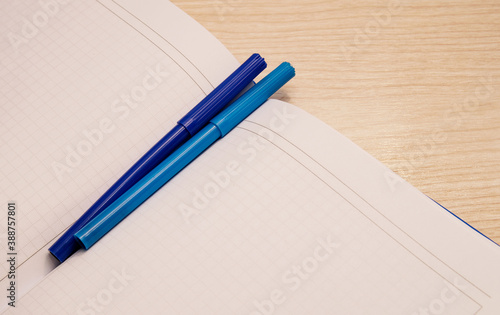 White blank notepad in a cage for recording lies on a wooden background with two blue felt-tip pens