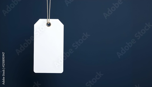 white blank tag, hanging price tag, dark blue background, minimalist, product label, simplicity, clean design, retail, merchandising, empty space, contrast, studio shot