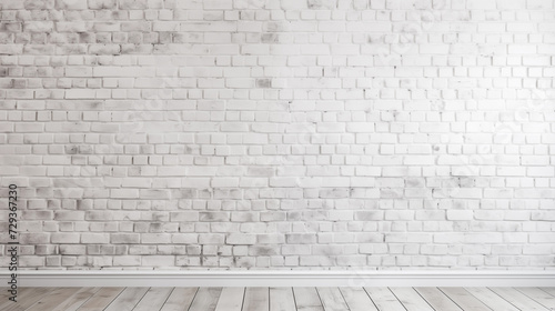 white brick wall panorama background and texture with wooden floor, generative AI.