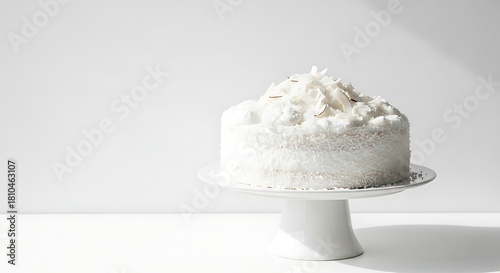 White cake on a white cake stand against a white background.