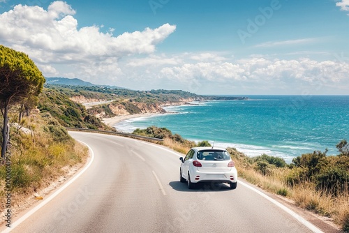 White car drive on road of mediterranean beach. driving on coast of Spain. Highway view on coast on way to summer holiday. Europe travel trip in sea coast road landscape. generative ai