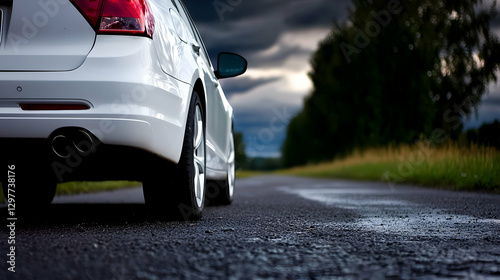 White Car Driving On Wet Asphalt Road In A Stormy Weather Against A Dark Nature Background
