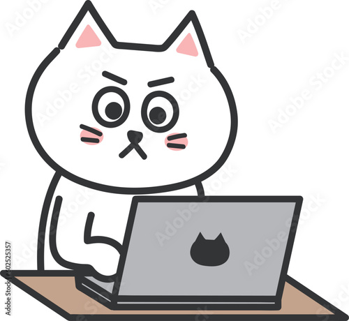 White cartoon cat staring at the computer screen, vector illustration.