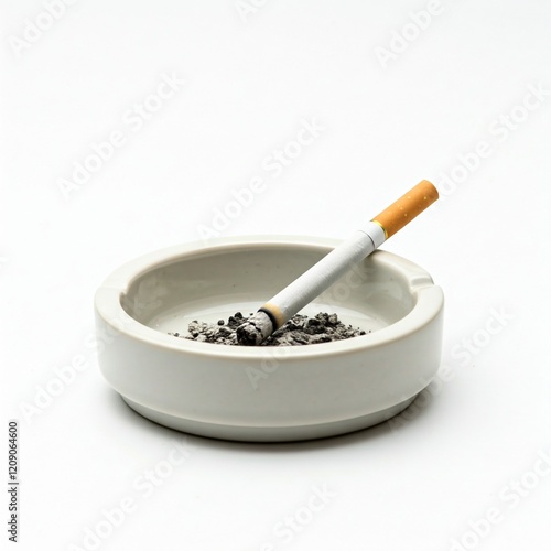 white ceramic ashtray with cigarette and ashes on a white background
