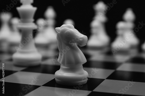 white chess knight horse in focus and chess pieces unfocused in the background