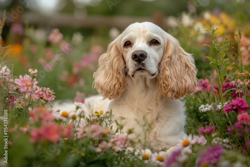 White Cocker Spaniel in wildflower meadow under soft daylight