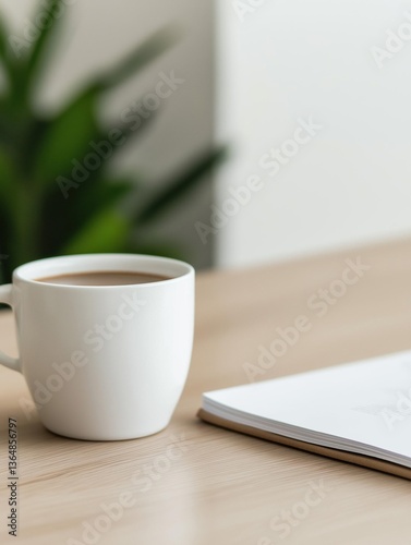 White coffee cup on a wooden table. the cup is filled with a dark brown liquid, possibly coffee, and is placed next to a notebook. the notebook is open and has a blank page.