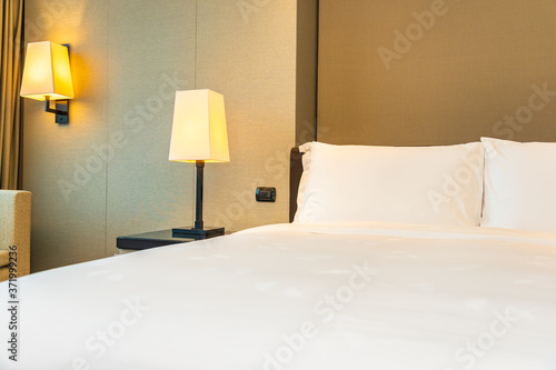 White comfortable pillow and blanket on bed with light lamp