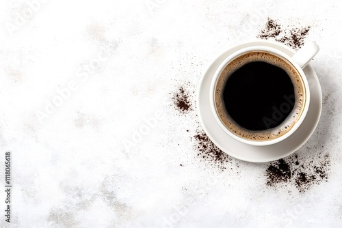 White cup of coffee on a saucer, surrounded by ground coffee, placed on a white textured background, creating an elegant and minimalist composition with copy space