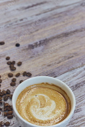 white cup with black coffee with milk. Handful of coffee beans on a wooden table. vertical view of drink with coffee. Copy space close up.