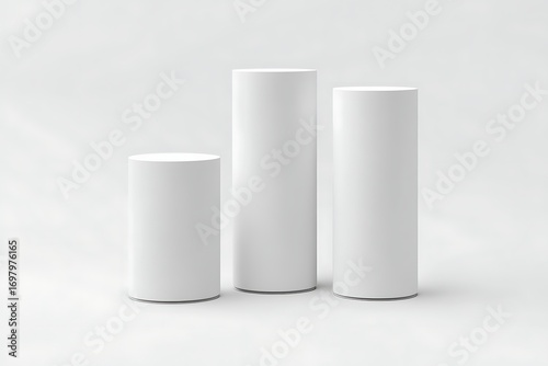 White cylinders on a white background. Three pillar objects. Minimalist